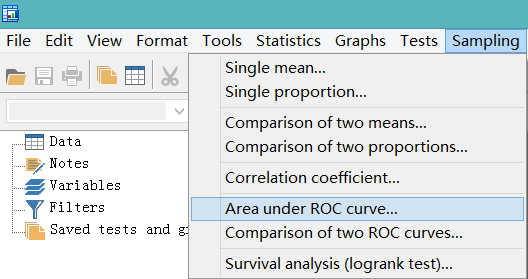 一、问题与数据 最近小宋医生在撰写一项项目书,研究设计是诊断试验,研究目的是探讨在使用呼吸机的病人中,与金标准相比,A指数预测撤机(呼吸机)失败的准确性。但是小宋医生不知道样本量怎么计算,所以跑来找小咖帮忙。 小宋医生希望该研究的ROC曲线下面积的最小值为0.80。假设α=0.05,β=0.10,预计10%的失访率,本研究拟定撤机失败的病人和撤机成功的病人数目相等,则该研究需要多大的样本量呢? 二、对问题的分析 小宋医生的研究为诊断试验,要使用ROC曲线下面积计算样本量,首先应当根据研究目的设定最小的ROC曲线下面积。然后拟定检验水准α和检验效能1-β,以及所需要的阴性组与阳性组的比例,即撤机失败的病人和撤机成功的病人之比。 根据上面的叙述得知ROC曲线下面积最少0.80,α=0.05,β=0.10,阴性组与阳性组的比例为1。 下面我们来看一下如何用Medcalc软件实现样本量计算。 三、Medcalc操作方法 1. 选择Sampling→Area under ROC curve… 2. Type I error (Alpha, Significance)中填入0.05;Type II error (Beta, 1-Power)中填入0.10;Area under ROC curve中填入最小可接受的ROC曲线下面积0.80;Null hypothesis value指零假设下即A指数无诊断价值时的ROC曲线下面积0.5(为什么ROC曲线下面积是0.5时没有诊断价值,请参考之前发过的“了解ROC曲线下面积,有这篇文章就够了”);Ratio of sample sizes in negative/positive groups:阴性组与阳性组的比值为1。点击Calculate。 计算结果见下图,在计算结果的表中找到本研究α=0.05和β=0.10对应的值,为17+17。