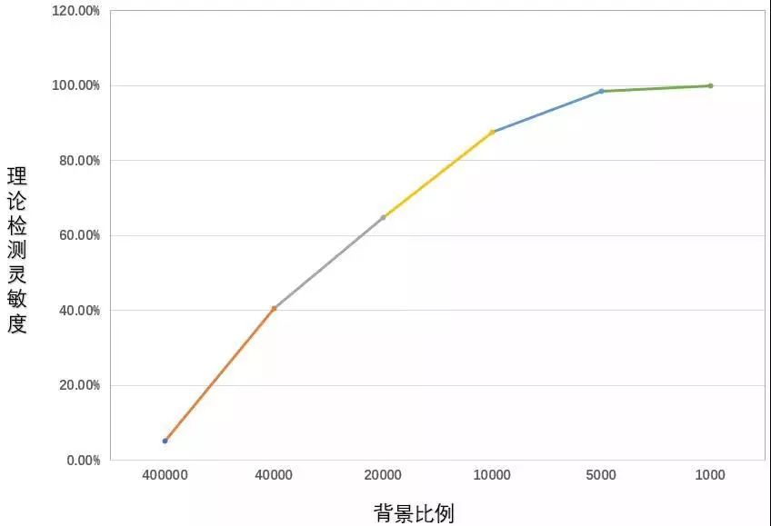 检测n条序列其中包含1条以上目的片段的敏感性为:1 - (1-M/G)^n =1 - (1-C0G0/ ∑i=1,k CiGi)^n ≈ 1 - (1-C0G0 / C1G1)^n。