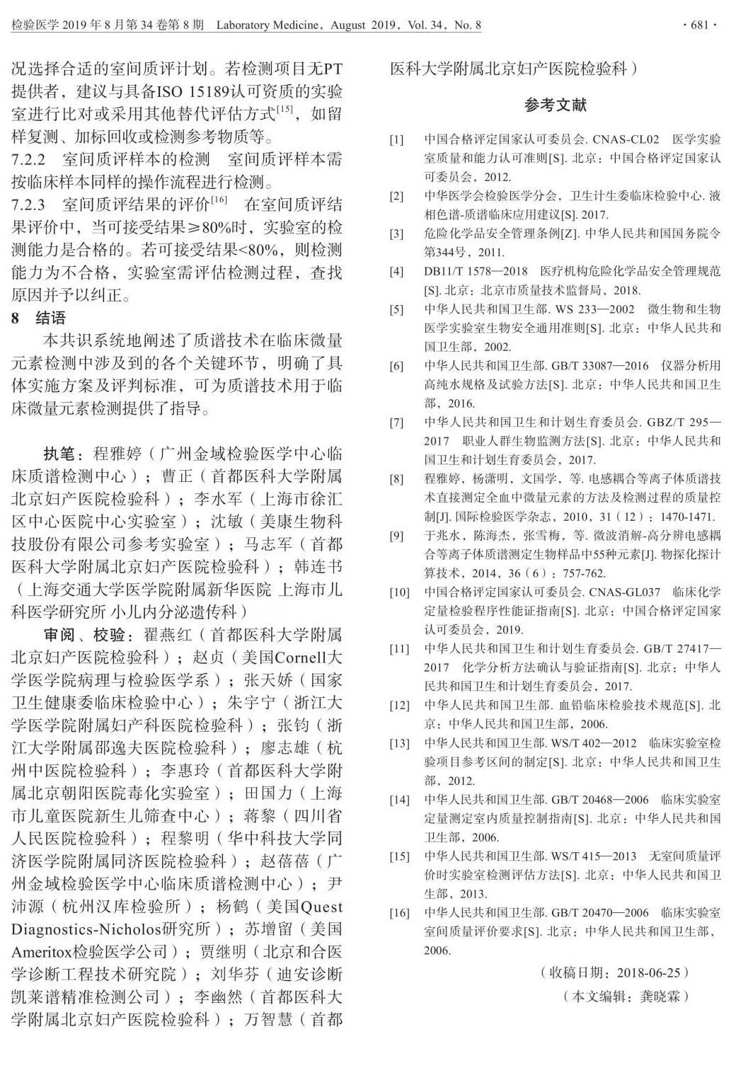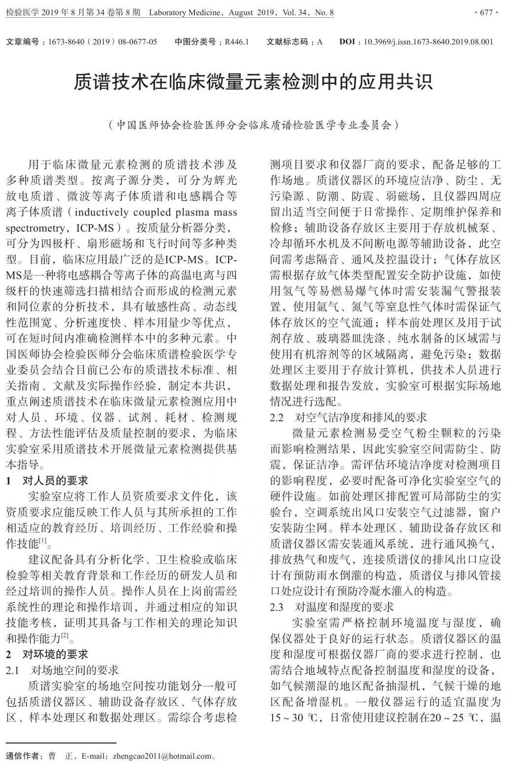 中国医师协会检验医师分会临床质谱检验医学专业委员会结合目前已公布的质谱技术标准、相关指南、文献及实际操作经验,制定本共识,重点阐述质谱技术在临床微量元素检测应用中对人员、环境、仪器、试剂、耗材、检测规程、方法性能评估及质量控制的要求,为临床实验室采用质谱技术开展微量元素检测提供基本指导。该共识发表于检验医学 2019年8月第34卷第8期。▼点击图片放大查看