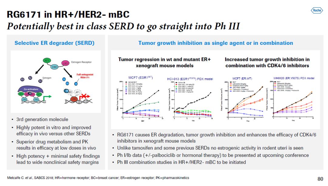 ▲Ipatasertib简介(图片来源:参考资料[1]) 这款在研疗法同时作为一线疗法,在治疗转移性去势抵抗性前列腺癌(mCRPC)患者的临床试验中表现出积极疗效。而且,PTEN基因缺失(导至PI3K/AKT信号通路激活)患者对它的反应更为明显。在靶向疗法方面,罗氏的RG6114是一款潜在“best-in-class”PI3K抑制剂。它对PI3Kα具有更高的特异性,因此具有更好的安全性特征。而且,它可以导至PI3Kα突变体被降解,从而提供强力持久的抑制效果。这款新药在1期临床试验中的表现非常积极,罗氏将直接跳过2期临床试验,在今年晚些时候开展3期临床试验,检验它在治疗携带PI3KCA基因突变的HR阳性/HER2阴性转移性乳腺癌患者中的疗效。 另一款针对HR阳性乳腺癌患者的在研疗法是特异性雌激素受体降解剂RG6171。这是罗氏开发的第三代分子,不但降解雌激素受体(ER)效力强劲,而且具有非常好的药代动力学特征。在动物模型中,它可以通过降解ER,抑制肿瘤生长,提高CDK4/6抑制剂的疗效。RG6171也已经取得了积极的1/1b期临床结果,罗氏准备直接启动3期临床试验,检验它与其它药物联用,治疗HR阳性/HER2阴性转移性乳腺癌患者时的疗效。