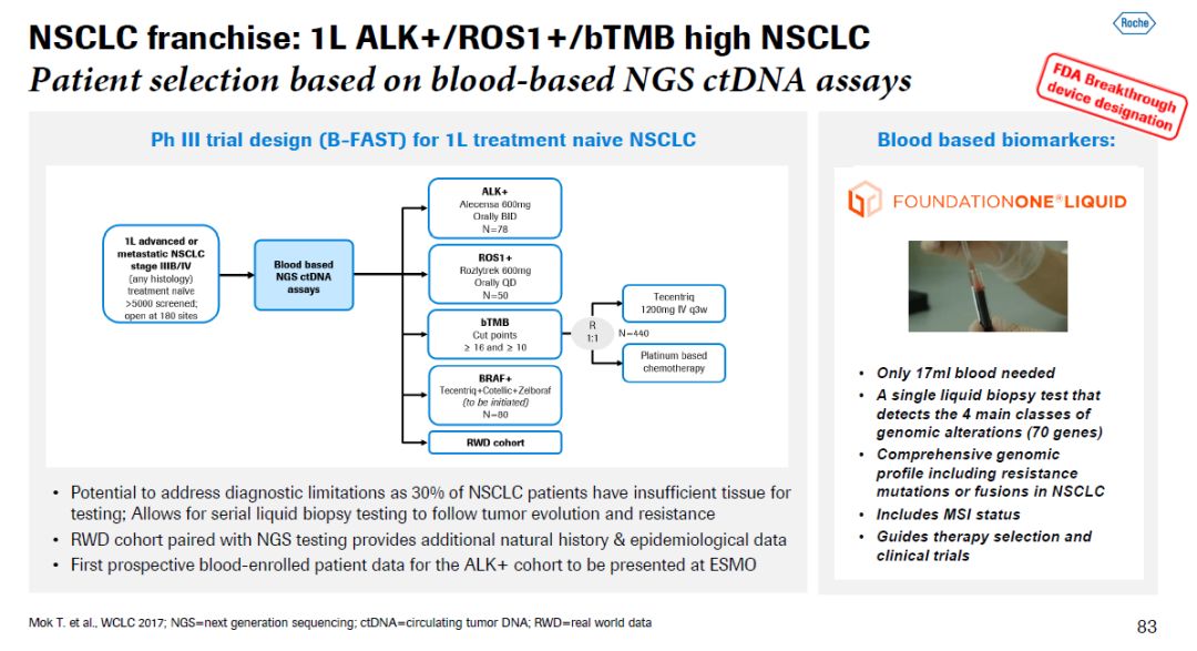 ▲RG6171简介(图片来源:参考资料[1]) 罗氏日前宣布,Tecentriq作为一线疗法,在单药治疗PD-L1阳性非小细胞肺癌的3期临床试验中达到了试验的主要终点。这一试验的详细数据将在月底开幕的ESMO大会上宣布。罗氏的药物管线中拥有多款可以治疗NSCLC患者的靶向疗法和免疫疗法。然而,大约有30%的患者没有足够的肺组织来进行基于组织活检的分子诊断,他们无法从多种靶向药物中获益。因此罗氏设计的B-FAST 3期临床试验将使用Foundation公司的液体活检技术来对患者的分子生物标记物进行检测,并且依据液体活检的结果对患者进行分类,给予他们个体化的治疗。同时这一临床试验将纳入一个基于真实世界数据(RWD)的患者队列。Horning博士表示,这是第一项基于液体活检注册患者的前瞻性临床试验,其结果将在ESMO年会上公布。