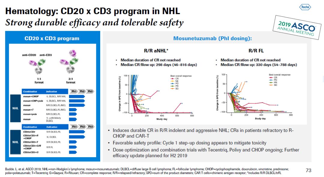 目前这两款双特异性疗法在多项临床试验中,作为单药或者与其它疗法联用,治疗不同类型的非霍奇金淋巴瘤(NHL)。在1期临床试验中,mosunetuzumab能够给复发/难治性(R/R)侵袭性NHL和滤泡性淋巴瘤(FL)患者带来长久的完全缓解。这些患者中有的已经接受过CAR-T疗法并且疾病继续进展。而抗CD20/抗CD3比例为2:1的双特异性抗体在治疗R/R侵袭性NHL患者时也表现出良好的疗效和安全性,总缓解率(ORR)达到58%,完全缓解率(CR)达到39%。