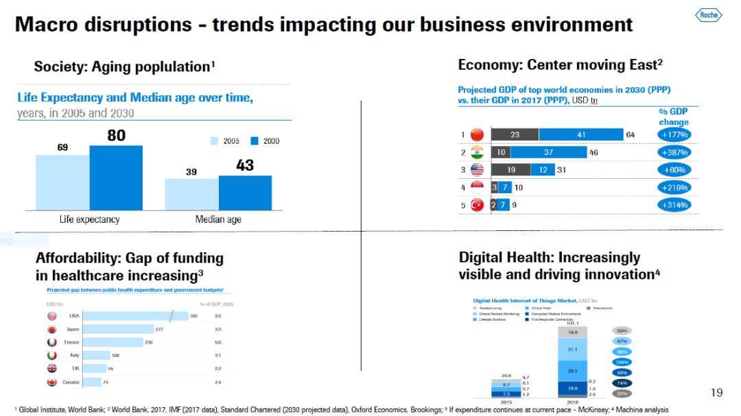 罗氏首席执行官Bill Anderson先生表示,现今的世界人口老龄化日益显著,虽然医药领域的进步迅速,仍然有很多未竟医疗需求。然而,医药的可及性问题不论是在发达国家还是发展中国家都变得更为尖锐。所以世界对医药行业的需求是:开发更多和更好的创新疗法,但是它们的成本需要受到控制。这也是罗氏药物开发的目标:如何在控制成本的同时,为社会提供更多更好的创新疗法。此外,亚洲将在医药行业的发展中起到举足轻重的作用,而数字健康将成为驱动创新的重要因素。