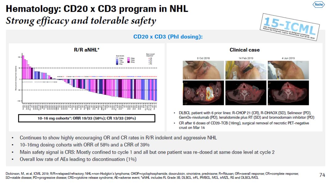 ▲罗氏血液学药物研发管线为构建组合疗法提供多种选择(图片来源:参考资料[1])例如,Venclexta(Bcl2抑制剂)和Gazyva(抗CD20抗体)组合在一线治疗慢性淋巴细胞白血病(CLL)患者时在无进展生存期(PFS)和微小残留病(MRD)上获得了出色的结果。这款非化疗组合疗法将患者疾病进展和死亡风险降低67% (HR=0.33),在递交监管申请后10周就通过FDA的实时肿瘤学审评(RTOR)试点项目获得了批准。Horning博士还介绍了罗氏的CD20/CD3双特异性抗体的研发进展。该公司的CD20/CD3双体异性抗体包括两种结构的候选药物,其中mosunetuzumab的抗CD20片段与抗CD3片段的比例为传统的1:1。而另一款双特异性抗体的抗CD20片段与抗CD3片段的比例为2:1。Horning博士表示,这种设计可以让双特异性抗体具有更高的效力、亲和力,在细胞表面抗原表达量更少的情况下也可以起作用。