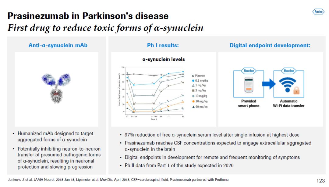 ▲治疗亨廷顿舞蹈症的ASO疗法(图片来源:参考资料[1]) 该公司还开发了一款靶向突触核蛋白(synuclein)聚合体的单克隆抗体prasinezumab。它可能抑制具有毒性的突触核蛋白在神经元之间的传播,从而起到保护神经的作用。Prasinezumab已经完成1期临床试验,2期临床试验的结果预计在2020年获得。这项临床试验的独特之处在于使用数字临床终点来检测患者的症状变化。