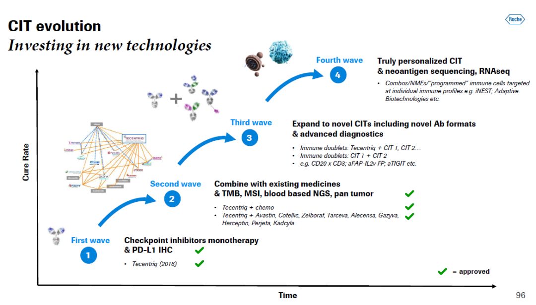 ▲罗氏肿瘤学研发的技术平台(图片来源:参考资料[1]) Horning博士在总结罗氏肿瘤学研发管线进展时,提到该公司具有多种技术平台,能够从不同角度对癌症发起“进攻”。她也回顾了罗氏癌症免疫疗法在过去几年里的迅速发展,从第一波的单药癌症免疫疗法,扩展到第二波的免疫疗法与现有疗法的组合。如今这一领域的第三波发展带来了具有创新结构和创新靶点的免疫疗法和组合疗法。她认为,未来我们将向真正的个体化疗法进军,依据患者的特定免疫特征(包括使用RNAseq等手段发现他们携带的新抗原),选择最适合他们的治疗模式。 ▲罗氏癌症免疫疗法研发的发展趋势(图片来源:参考资料[1])