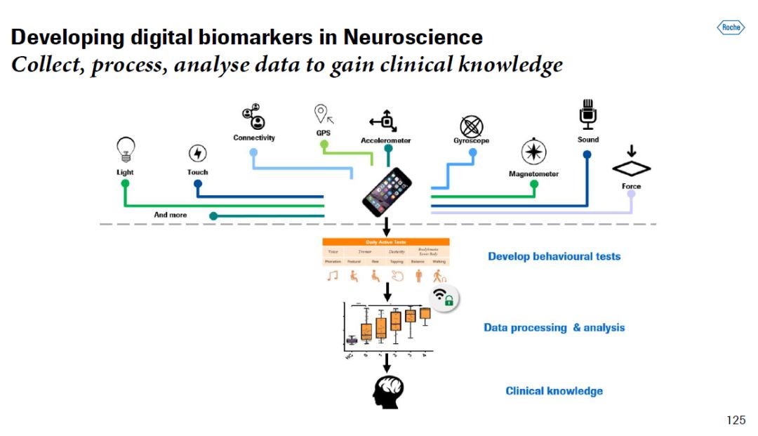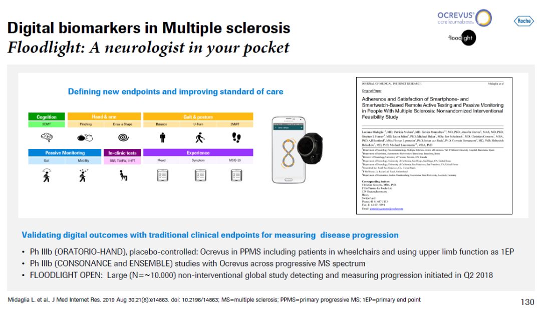 ▲Prasinezumab简介(图片来源:参考资料[1]) Fontoura博士尤其强调了数字生物标志物在治疗神经疾病的药物开发方面的重要性。他认为,困扰神经疾病药物开发的一个难点是对临床终点的检测非常困难。通常检测结果噪声很大,主观性很高,因此,要判断一款新药是否起作用,可能需要耗时很长,患者数量非常大的临床试验。如果能改变这一现状,不但对患者诊断和治疗,也对新药开发将产生显著影响。罗氏的策略是通过利用高科技产品,尤其是可佩戴设备,以更高的频率从患者那里获得更高质量的数据,通过分析这些数据来提供临床洞见。 ▲为治疗神经疾病开发数字生物标志物(图片来源:参考资料[1]) 为了说明数字生物标志物的优越性,他举了一个浅显的例子。他说,假设一个患者一年365天中通常只接受两次随访,然而他的症状每天都在变化,而患者通常只能记住一周内自己症状的变化,那么每年两次的随访对患者疾病变化的了解非常有限,并且可能不具有代表性。这对于药物开发人员来说是一场灾难。而解决这个问题的方法,他说,是在每个患者的口袋里“放一个神经内科学家”。 ▲传统随访对症状检测的局限性(图片来源:参考资料[1])罗氏的Floodlight智能手机软件能够对患者的多个指标进行被动和主动测试,从而构建新的临床终点,改善对患者的治疗模式和药物开发模式。目前,Floodlight构建的临床终点的有效性正在治疗多发性硬化症患者和帕金森患者的临床试验中接受检验。在治疗帕金森患者的临床试验中,数据显示患者使用手机软件的依附性很高,检测的可重复性很高,更重要的是手机软件产生的临床终点与传统临床终点也具有一致性。罗氏将在所有神经疾病的药物研发过程中采用数字生物标志物。Fontoura博士表示,数字生物标志物的广泛使用将有可能为神经疾病的药物研发带来革命性的变化。 ▲罗氏开发的Floodlight手机程序(图片来源:参考资料[1])