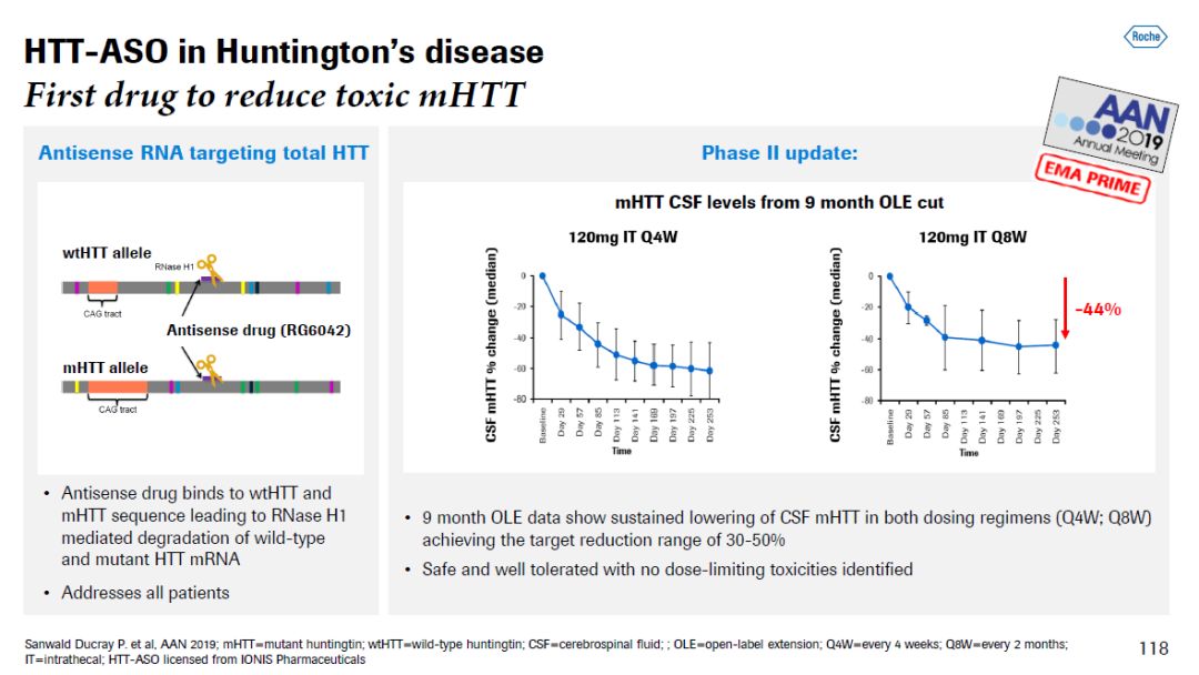 ▲Satralizumab作为附加疗法的疗效(图片来源:参考资料[1]) 罗氏还与Ionis Pharmaecuticals公司合作,开发一款治疗亨廷顿舞蹈症(Huntington’s disease)的反义寡核苷酸(ASO)疗法。这款ASO疗法通过与表达亨廷顿蛋白的HTT基因的mRNA相结合,抑制亨廷顿蛋白的表达。患者只需要每两个月接受一次治疗,就可以将携带突变的亨廷顿蛋白控制在产生疗效的水平。目前,检验这一疗法的3期临床试验正在进行中,第一名患者已经入组。