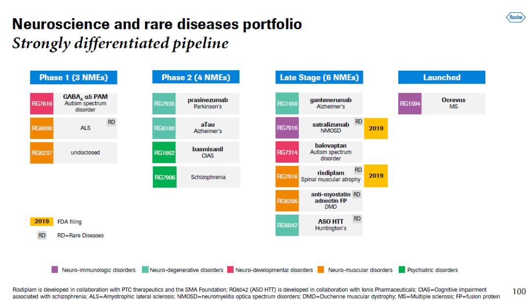 罗氏神经科学和罕见病临床开发全球负责人Paulo Fontoura博士介绍了罗氏的神经科学和罕见病研发管线。他表示,罗氏拥有一个非常差异化的研发管线,其中,治疗脊髓性肌肉萎缩症(SMA)和risdiplam和治疗视神经脊髓炎谱系障碍(NMOSD)的satralizumab将在今年递交上市申请。