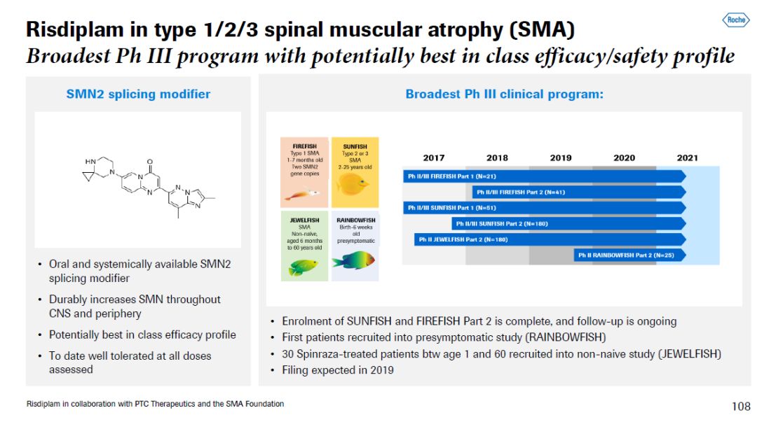 ▲罗氏神经科学和罕见病药物研发管线(图片来源:参考资料[1]) Risdiplam是一款口服SMN2基因剪接调节剂,它通过调节SMN2基因的剪接过程,提高SMN蛋白在中枢神经系统(CNS)和外周的表达。对于一些严重SMA患者来说,他们可能因为身体原因,无法接受其它SMA的治疗方法,因此一款口服疗法能够为他们的治疗带来便利。目前,这款在研新药在3期临床试验中治疗多种疾病严重程度不一的SMA患者。已有临床试验结果表明,它在治疗1型SMA婴儿患者时表现出优异的疗效,90.5%的患者在接受治疗后仍然存活并且无需永久呼吸辅助。在接受高剂量risdiplam治疗的患者中,41%的患者能够自己坐起来,59%的患者运动能力评分显著提高。