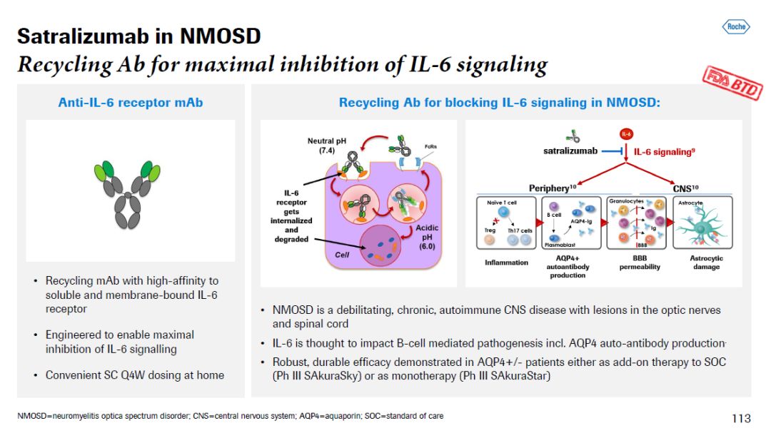▲Risdiplam简介(图片来源:参考资料[1]) 而且,在治疗年龄更大的2型和3型SMA患者的临床试验中,risdiplam同样可以显著提高患者的运动能力评分。Satralizumab是一款抗IL-6单克隆抗体。它不但能够最大限度地抑制IL-6信号通路,而且可以影响B细胞生成抗AQP4蛋白的自身抗体。抗AQP4蛋白的自身抗体是NMOSD的致病重要因素。
