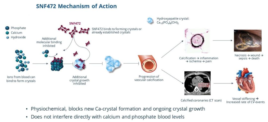 临床专攻:开发治疗钙化防御(calciphylaxis)的创新疗法。 钙化防御是一种皮肤和脂肪组织的严重血管钙化疾病。在小血管中的钙沉积会导至血管阻塞,带来非常疼痛的失能性慢性皮肤病变。钙化防御在1-4%接受透析的慢性肾病患者中产生,患者一年死亡率高达55%。该公司的主打产品SNF472是一款具有独特机制的钙化抑制剂。它的作用方式是与钙化部位的羟基磷灰石(HAP)晶体相结合,从而抑制晶体的继续增长,防止血管的阻塞。SNF472在2期临床试验中已经表现出促进伤口愈合和控制与钙化防御相关疼痛的效果。它已经获得美国FDA和欧盟EMA授予的孤儿药资格。检验它的疗效的3期临床试验将在今年晚些时候进行。