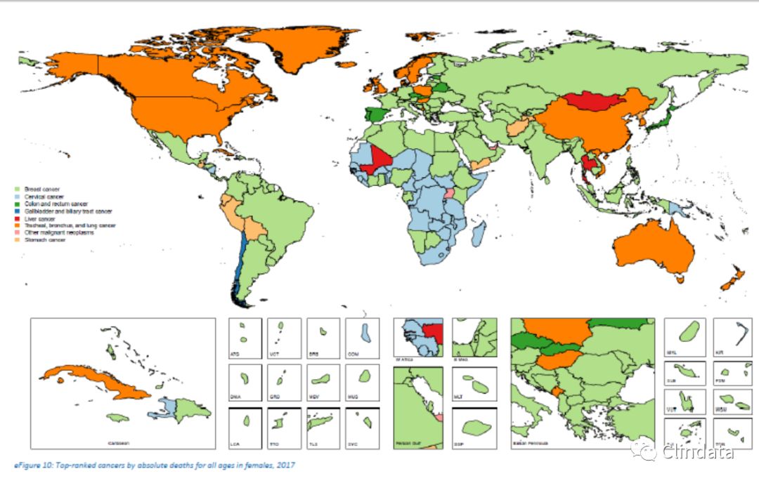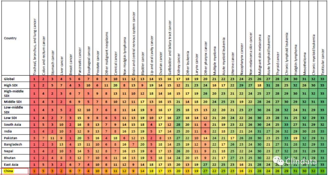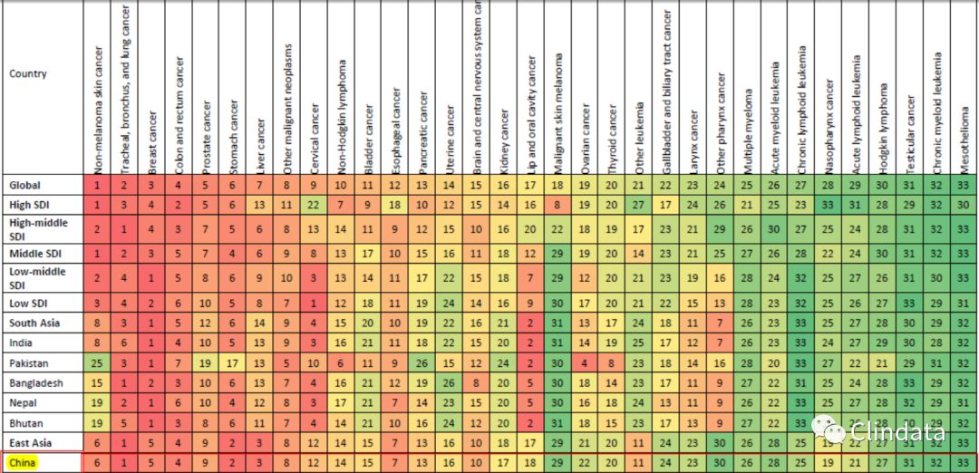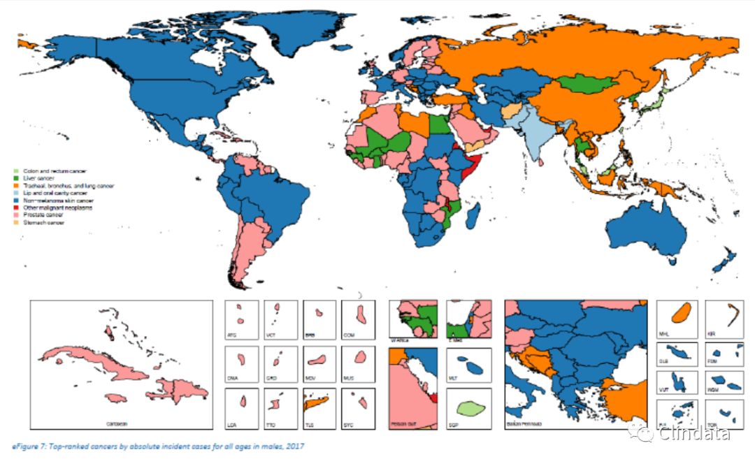 重要性 癌症和其他非传染性疾病(NCD)现在被广泛认为是对全球发展的威胁。联合国非传染性疾病最新高级别会议重申了这一观点,并强调了在实现2011年《关于预防和控制非传染性疾病的政治宣言》和第三个可持续发展目标方面进展缓慢。缺乏情况分析,确定优先重点和预算是实现这些目标的主要障碍。所有这些共同点在于,它们需要有关当地癌症流行病学的信息。全球疾病负担(GBD)研究具有独特的优势,可以提供这些关键数据。 目的 描述1990年至2017年间195个国家的29个癌症组的癌症负担,以提供癌症控制规划所需的数据。 证据审查 我们使用GBD研究估算方法来描述癌症发生率,死亡率,残障生存年限,生命损失年限以及残障调整生命年(DALYs)。结果在国家一级以及社会人口统计学指数(SDI)上进行显示,该指标是收入,教育程度和总生育率的综合指标。我们还分析了流行病学与人口学转变对癌症发病率的影响。 发现 2017年,全球有2450万例癌症事件(1680万例无非黑色素瘤皮肤癌[NMSC])和960万例癌症死亡。大多数癌症DALY来自失去生命的岁月(97%),只有3%来自患有残疾的岁月。男女患低SDI的几率最低(七分之一),高SDI的几率最高(二分之一)。2017年,男性最常见的事件癌症是NMSC(430万起事件);气管,支气管和肺癌(TBL)(150万起事故);和前列腺癌(130万起事件)。男性最常见的癌症死亡和DALY原因是TBL癌(130万死亡和2840万DALY),肝癌(572 000死亡和1520万DALY)和胃癌癌症(542 000例死亡和1220万DALYs)。对于2017年的女性而言,最常见的事件癌症是NMSC(330万事件),乳腺癌(190万事件)和大肠癌(819 000事件)。女性癌症死亡和DALY的主要原因是乳腺癌(601 000例死亡和1740万DALYs),TBL癌(596 000例死亡和1260万DALYs)和结直肠癌(414 000例死亡和830DALYs)。 结论与关联 全国癌症流行病学概况 GBD研究显示出巨大的异质性,这反映了不同的风险因素,经济环境,生活方式以及获得医疗和筛查的机会。政策制定者和其他利益相关者可以使用GBD研究来制定和改善国家和地方癌症控制,以实现全球目标并提高癌症治疗的公平性。Cancer is nowwidely recognized as a global problem that unfortunately lacks a global solution. The latest United Nations high-level meeting on noncommunicable diseases (NCDs) exemplified this conundrum. Despite global commitment to reducing the risk of and disability from NCDs,including cancer, implementation of knownsolutions is inadequate to reach the 2011 Political Declaration on the Prevention and Control of Noncommunicable Diseases(25% reduction in premature mortality from NCDs by 2025) and the third Sustainable Development Goal (by 2030 reduce by onethird premature mortality from NCDs through prevention and treatment, and promote mental health and well-being).To reduce cancer burden, identifying the scope of the problem and mapping out implementation of solutions is best done in National Cancer Control Plans (NCCPs). However, a recent review showed that only 29% of low-income countries had a NCCP, and even if NCCPs existed, cost, financing, monitoring,and expansion of information systems was often inadequate.Many highly effective prevention and treatment strategies exist for cancer.However, they are often very specific (eg,vaccination forhumanpapillomavirus and hepatitisBvirus for prevention of cervical and liver cancer, or tyrosine kinase inhibitors for cancerswith targetablemutations). Effective NCCPs therefore require detailed knowledge about the local burden of cancer and associated risk factors. We herein present results from the Global Burden of Disease (GBD) 2017 study describing cancer incidence, mortality, years of life lost (YLLs), years livedwith disability (YLDs), and disability-adjusted lifeyears (DALYs) for 195 countries from1990 through 2017, which can inform cancer control through policy, resource allocation,and health system planning.癌症已被广泛认为是一个全球性问题,但不幸的是缺乏全球性解决方案。最近的联合国非传染性疾病高级别会议就是这一难题的例证。尽管全球致力于降低包括癌症在内的非传染性疾病的风险和致残性,但已知解决方案的实施仍不足以达成2011年《关于预防和控制非传染性疾病的政治宣言》(到2025年使非传染性疾病的过早死亡减少25%)和第三次可持续发展。发展目标(到2030年,通过预防和治疗将非传染性疾病的过早死亡率降低三分之一,并促进心理健康和福祉)。减少癌症负担,确定问题的范围并规划解决方案的实施最好在国家癌症中心控制计划(NCCP)。然而,最近的一项审查表明,只有29%的低收入国家拥有NCCP,即使存在NCCP,信息系统的成本,融资,监控和扩展也常常不足。许多有效的癌症预防和治疗策略存在但是,它们通常非常具体(例如,人乳头瘤病毒和乙型肝炎病毒的疫苗接种,以预防子宫颈癌和肝癌,或酪氨酸激酶抑制剂用于具有可靶向突变的癌症)。因此,有效的NCCP需要有关癌症局部负担和相关风险因素的详细知识。我们在此提供了2017年全球疾病负担(GBD)研究的结果,该研究描述了1990年至2017年间195个国家的癌症发病率,死亡率,生命损失年限(YLLs),残疾寿命年限(YLDs)和残疾调整生命年(DALYs)。可以通过政策,资源分配和卫生系统规划来告知癌症控制。Methods Methods have remained similar to the GBD 2016 study.Detailed descriptions of the methods can be found in theGBD 2017 publications as well as in the eAppendix, eFigures, and eTables in the Supplement.For eachGBDstudy, the entire time series is re-estimated. This study therefore supersedes prior GBD iterations. The GBD study is compliant with the Guidelines forAccurate and TransparentHeal