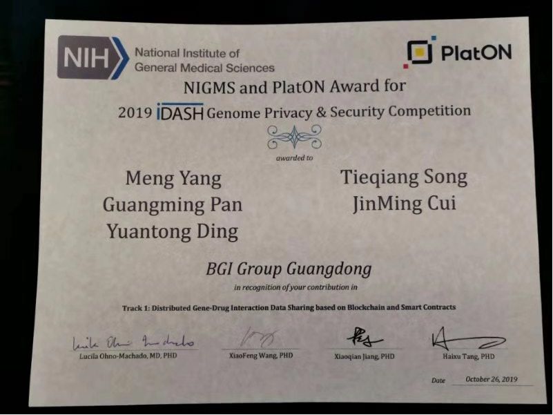 2019年10月26日,由美国国立卫生研究院(National Institutes of Health,NIH)指导并资助举办的2019年基因数据隐私和安全计算大赛(iDASH)颁奖仪式在美国印第安纳州举行,华大区块链团队作为获奖者受邀出席并作大会报告。 iDASH始于2014年,至今已成为全球基因组数据隐私保护和安全共享领域的最高规格国际竞赛,今年吸引了包括耶鲁大学、MIT、EPFL等在内的全球105所知名高校和来自工业界的团队参赛。据悉,华大在“基于区块链和智能合约构建基因变异分布式数据库”的赛道中脱颖而出,在“联合训练机器学习模型用于肿瘤分子分型”赛道中成功完成挑战赛,与耶鲁大学、桑迪亚国家实验室、埃默里大学、京都大学一起荣获大奖。华大大数据中心副主任杨梦出席颁奖仪式并介绍了相关工作,他表示:“该奖项标志着华大在区块链和隐私计算领域的技术积累获得了国际基因数据隐私保护学界的高度认可。”图:获奖证书