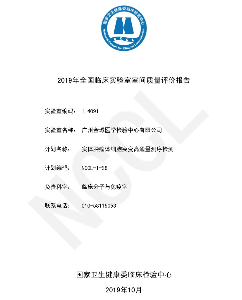 国家卫生健康委临床检验中心(NCCL, National Center for Clinical Laboratories)近日公布了《2019年全国实体肿瘤体细胞突变高通量测序检测室间质量评价》结果。全国实体肿瘤体细胞突变高通量测序检测室间质量评价计划,由国家卫生健康委临床检验中心(NCCL)组织筹划,旨在保证各临床实验室检测质量。该项室间质量评价计划可以确定参评实验室实体肿瘤体细胞突变高通量测序检测的能力,发现在检测过程中存在的问题,促进实验室提高检测水平。 本次室间质评由国家卫生健康委临床检验中心(NCCL)组织并实施。旨在保证个临床实验室检测的质量,该室间质量评价计划可以反映参评实验室实体肿瘤体细胞突变高通量测序检测的能力,促进实验室提高水平。本次能力验证我国共有来自20个省(市、自治区)的共184家实验室参加,共有165个实验室回报了结果,其中仅有90家实验室满分通过了质量检测(54.5%)。 部分满分实验室(排名不分分先后) 一、世和基因 二、求臻医学 三、泛生子医学检验四、金域医学五、北京吉因加
