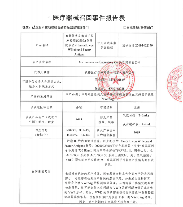 沃芬医疗器械商贸(北京)有限公司 报告,由于 近期IL的内部测试发现,4个批次的HemosIL von Willebrand Factor Antigen (货号:0020002300)不符合其标签上关于“类风湿因子不超过750 IU/mL时结果不受影响”的声明。IL 调查认为,在ACL TOP系列和ACL TOP 50系列上测定时,关于类风湿因子(RF)影响的声明应修改为:类风湿因子可能会产生偏高的测试结果。 虽然没有已知的客户投诉,但如果患者样本包含高水平的类风湿因子,可能存在检测结果错误的潜在风险。如果发生此种情况,可能会导至VWF:Ag的检测结果偏高,从而掩盖了其偏低的异常检测结果,这可能会将本应判断为VWD的而判断为低的或正常的VWF水平。然而,VWD的诊断需要包括临床背景和重复验证试验等其他信息。没有任何治疗是仅基于单一的VWF: Ag结果。因此,这个问题的安全风险可以忽略不计 等原因,Instrumentation Laboratory Co.仪器实验室公司 对其生产的血管性血友病因子抗原检测试剂盒(免疫比浊法) HemosIL von Willebrand Factor Antigen(注册或备案号:国械注进20193402179)主动召回。召回级别为 三级 。涉及产品的型号、规格及批次等详细信息见《医疗器械召回事件报告表》。