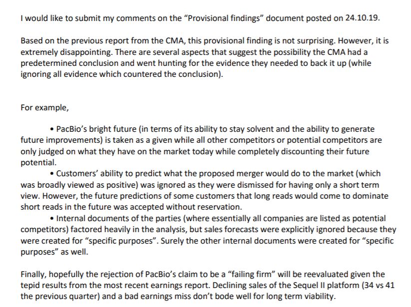 2018年11月,基因测序巨头Illumina拟对PacBio的12亿美元收购案一度引发全球基因测序行业的广泛关注。通过将Illumina的短读长测序技术和PacBio的长读长测序技术相结合,这项交易势必将进一步巩固Illumina在基因测序领域的优势地位。 但消息发布后,该交易迅速引起了英国监管部门的关注。2019年4月,英国反垄断监管机构——竞争和市场管理局(CMA)发表声明,表示已对该交易展开调查并正在探讨该收购可能带来的影响。2019年10月24日,CMA发布调查文件,表示已“暂时得出结论”:该收购计划将导至英国乃至全球下一代测序系统市场的竞争大幅减少。CMA认为,现阶段唯一可能有效的补救措施是禁止拟议的收购交易,以保持英国以及全球测序市场的竞争,并提议Illumina、PacBio和公众提出其他补救措施。本月,对于CMA发布的调查结果,Illumina及PacBio进行了回应并提出了相关补救措施。根据11月19日CMA发布的一项文件,Illumina和PacBio提议,如果这项收购完成,将为所有感兴趣的第三方提供Illumina及PacBio的pre-closing专利及专利申请的永久的、免版税的、不可变更的技术许可,但只可用于单分子和长读长测序,以及自然界存在的DNA/RNA测序系统和相关涉及测序的化学过程。此外,Illumina还建议为第三方建立争议解决机制,以解除各方对Illumina违反其承诺的担忧。(虽然Illumina已作出了颇为有力的让步,但这些提议举措似乎还难以完全消除CMA及该领域其他竞争对手的担忧。就在上周,英国第三代测序领域上游制造商Oxford Nanopore(牛津纳米孔)在一份提交至CMA的文件中对Illumin提出的补救措施进行了回应。Oxford Nanopore认为,Illumina公司向第三方授权相关知识产权以获得收购PacBio许可的提议还远远不够;相反,Oxford Nanopore提议,如果这项交易完成,Illumina应拆分部分业务,例如NovaSeq产品线——而这正是Illumina目前最为成功的核心测序平台。图:Oxford Nanopore对Illumin就收购PacBio提出的补救措施回应,图片来源:gov.uk 在这份11月21日提交至CMA并于昨日发布的文件中,Oxford Nanopore评论道:“这项空洞的提案无助于消除该收购在英国或全球范围内所带来的限制市场竞争的影响。”Oxford Nanopore重申了合并后的Illumina及PacBio将在“NGS市场上占据垄断地位”,预计其在英国的市场份额将超过90%,在全球的市场份额将超过80%。 此外,Oxford Nanopore还表示,Illumina提议开放的知识产权许可“存在严重的局限性,似乎仅限于一个非常有限的使用领域。”在Oxford Nanopore看来,Illumina补救措施中所定义的应用领域可能会排除非自然界存在的DNA测序等,例如cDNA或扩增的DNA。Oxford Nanopore在文件中写道,该许可仅适用于一小部分下一代测序市场,将无法涵盖当前及未来使用Oxford Nanopore或其他测序技术的大范围生物分析。在补充文件中,Oxford Nanopore列出了其认为可能不会被开放知识产权覆盖的应用领域,包括扩增子测序、STR测序、通过cDNA进行的RNA测序、宏基因组测序、无创产前检测、新生儿筛查、循环DNA分析、基于FFPE组织的DNA测序以及古DNA测序。Oxford Nanopore还强调,无论知识产权的覆盖范围最终如何,Illumina和PacBio仍然可以采取反竞争策略,以阻止竞争对手进入市场或扩张。鉴于市场的挑战以及合并实体的强大实力,Illumina和PacBio提供的知识产权许可无论多么宽泛,都无法在可预见的未来确保其从事反竞争行为。Oxford Nanopore建议,除了提供“广泛的知识产权许可”,合并后的公司应该拆分部分业务,例如Illumina的NovaSeq产品线。鉴于NovaSeq对Illumina业务的重要性,这一举措似乎很难成为现实。以Illumina第三季度的营收为例,NovaSeq测序仪的销售额为Illumina第三季度测序仪器的营收增长贡献达1.42亿美元。除此之外,Illumina首席执行官Francis deSouza在第三季度财报电话会议上还表示,NovaSeq近期已超过HiSeq X成为产生最多测序数据的平台且仍有广阔的发展机会。图:Shawn Baker就CMA调查结果评论,图片来源:gov.uk 值得关注的是,对于Illumina对PacBio的收购,并非所有机构都与Oxford Nanopore持类似意见。 在发布Oxford Nanopore回应文件的当天,CMA还发布了基因组学商业咨询公司AllSeq联合创始人Shawn Baker博士的一份评论,其中暗示CMA的调查结果有失客观。Shawn Baker强调,CMA将PacBio在不与Illumina合并的情况下保持偿债能力视为“既定条件”,但在评估竞争对手时并未考虑PacBio未来增长压力,并忽视了该公司的营收预测。鉴于PacBio最新的季度营收报告,尽管测序仪器销售额同比增长强劲,但是Sequel II平台的销售额却出现了连续的下降。他还暗示,CMA似乎忽视了那些认为Illumina和PacBio的合并将有利于测序市场的客户,只听取了那些认为长读长测序将在未来主导短读长测序客户的意见。对于Oxford Nanopore本次发表的意见,目前Illumina及PacBio还未作出回应。 |