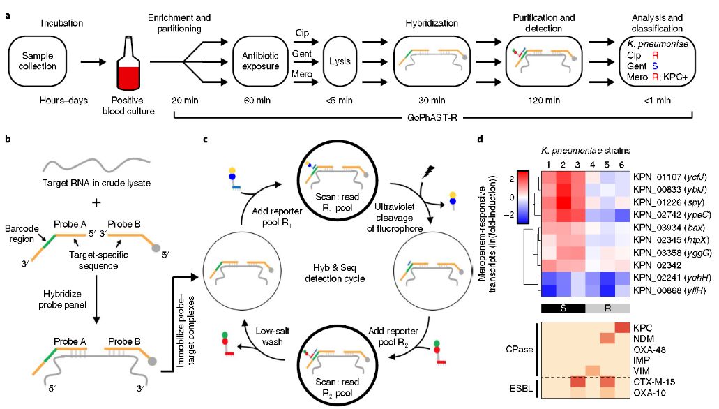 ![]() 抗生素与我们的生活密切相关,它就像一把“双刃剑”,昔日是对抗疾病延长生命的“万能神药”,随着高频率滥用,而今抗生素的耐药性问题已成为世界卫生领域的重大难题,并严重威胁人类健康。由此,在临床治疗中,快速检测抗生素敏感性技术将为人类带来新福音。 近日,美国哈佛大学联合麻省理工综合医院的研究人员开发出一套能够同时检测基因型和表型的“稳准快”抗生素敏感性检测方法,并在国际顶级期刊Nature Medicine发表了相关成果。 ![]() 19世纪末20世纪初,抗生素的发现改变了世界抵御疾病的原始方式,就像“秘密武器”最终出场,人类寿命因此也大大提高。而随着发现和使用还不到一百年,细菌生物对抗生素的耐药性不断增强,“超级细菌”的概念更让人细思极恐,所谓的抗生素耐药已经成为困扰世界各国的重大挑战。根据世卫组织数据报道,预计到2050年,每年会有1000万人因为细菌对抗生素产生耐药性而丧生,相当于每3秒钟就有1人死亡,危害程度赶超癌症。 面对这一重大生物安全隐患,及时诊断并使用最有效的抗生素以治疗细菌感染的患者将是最有效的解决方法。然而目前,临床上鉴定患者体内对哪些抗生素具有耐药性,而哪些抗生素可以有效使用的检测方法(如肉汤微量稀释),通常需要2天以上,甚至一周时间,这种情况下,患者通常难以忍受病痛,医生只能开具广谱抗生素——如此一来,抗生素耐药情况便愈演愈烈,难以控制。 近日,来自哈佛大学Deborah T. Hung实验室的科学家们联合麻省理工总医院,一同开发了一种新的抗生素敏感性诊断方法,打破了时间和准确性壁垒,真正实现数小时准精准定位最佳抗生素,具有非常大的应用潜力。 现在临床上使用的抗生素敏感性测试(Antibiotic Susceptibility Testing, AST)的金标准主要包括两种,定位“表型”的方法要先从患者体内样本分离得到细菌,然后在用含各种抗生素的培养基中培养细菌,观察哪种抗生素药物可以有效抑制微生物生长,即获得表型结果;这种基于细菌培养的测定方法是准确的,但是培养过程耗时耗力。而最新的细菌“基因型”定位方法则以细菌的DNA为标准,检测发现已知具有耐药性的突变位点,这种方法虽然较快,但准确性较差,尤其是当产生未包含在测试内的耐药变异位点时,可能造成变异位点遗漏。 为了解决这两种检测方法各自存在的短板问题,研究团队将两种方法巧妙结合,取长补短,发明了一种基于RNA检测的基因型和表型双定位的抗生素敏感性测试方法,即GoPhAST-R(Combined genotypic and phenotypic AST through RNA detection)——在经过早期的抗生素诱导后,研究人员通过检测细菌中特定的信使RNA表达特征,结合高通量测序技术和机器学习的分析方法,同时检测关键性遗传抗性变化,对分离的临床菌株进行高准确度分类定位。这种方法可以在四个小时内提供准确结果,且精确度高达94-99%。 研究中,科学家发现,在培养皿中生长的同一种细菌在抗生素中暴露的数分钟内,其耐药性和药物敏感性变化具有不同的信使RNA(mRNA)表达模式,即反映活性变化的差异基因。该方法还分析了mRNA转录物的序列,以揭示细菌是否携带已知会引起耐药性的关键基因。随后,根据机器学习算法,识别最能区分药物敏感性和抗生素耐药性的mRNA转录物。最后GoPhAST-R方法使用这些转录本对药物敏感性未知的样品进行分类,通过定位不同药物敏感性的mRNA标记,在不受耐药性的潜在遗传因素影响的情况下,快速定位患者本身对某些抗生素的敏感性,产生准确结果。 研究团队证明了,GoPhAST-R可以识别出当今临床使用的三种主要抗生素类别的敏感性:卡巴培南,氟喹诺酮和氨基糖苷,它们对应五种经常具有耐药性的常见病原体:大肠杆菌,肺炎克雷伯菌,鲍曼不动杆菌,金黄色葡萄球菌和铜绿假单胞菌。此外,他们还利用GoPhAST-R方法快速测定了麻省理工总医院临床微生物实验室的患者样品中,有对环丙沙星的高敏感性结果,这些临床数据都再次证明了该检测方法的临床潜力。 为了使GoPhAST-R检测方法在保质保量的基础上,保证高效率检测,该团队还与NanoString生物技术公司合作,使用其二代RNA检测平台NanoString Hyb&Seq。如此一来,与使用标准临床实验室的方法进行28-40小时的培养分析相比,该仪器允许GoPhAST-R在血液培养中阳性细菌被检出后不到四小时的时间内确定抗生素敏感性结果。 ![]() GoPhAST-R检测方法的实验设计原理和在NanoString Hyb&Seq测序平台的工作流程(可区分易感菌株表型和检测抗性菌株遗传特征) 这一检测方法有效提高了抗生素耐药性检测的准确性,推动了耐药检测的分子流行病学发展,也为尽早发现新兴的耐药性机制提供了理论依据。这种双管齐下的诊断方法让检测时间缩短了数倍,但精确度不减,可谓“事半功倍”。一方面,此类方法有望得到进一步开发,争取应用于更多细菌感染和抗生素检测;另一方面,这种检测手段将真正改变临床上对细菌感染患者的诊断和护理方式,以确保更有效地部署现有的抗生素库使用,有效防止了耐药性“超级细菌”的进一步出现和传播。”(转化医学网360zhyx.com) 引用: Roby P. Bhattacharyya et al. Simultaneous detection of genotype and phenotype enables rapid and accurate antibiotic susceptibility determination, Nature Medicine (2019) |