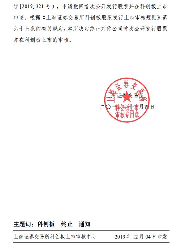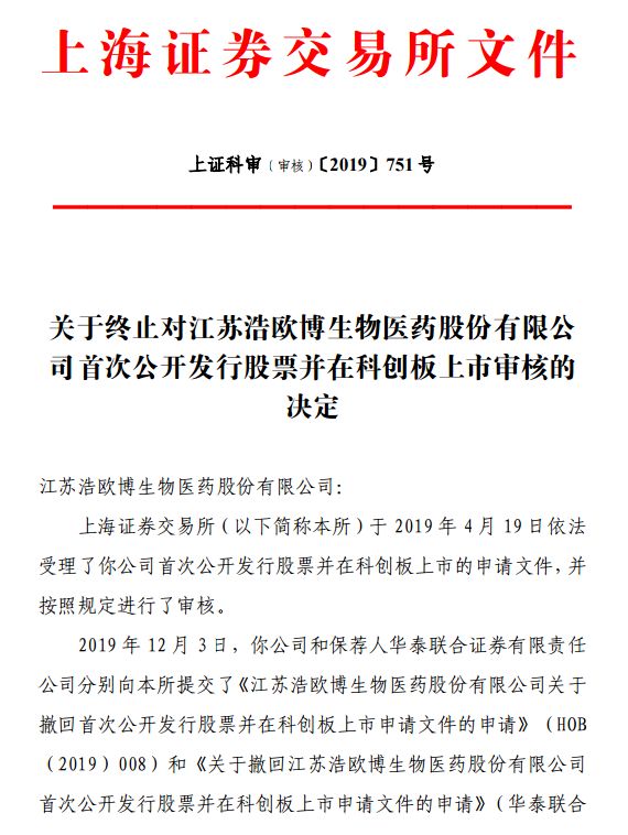12月4日上交所公告科创板拟上市公司江苏浩欧博生物医药股份有限公司终止审核。