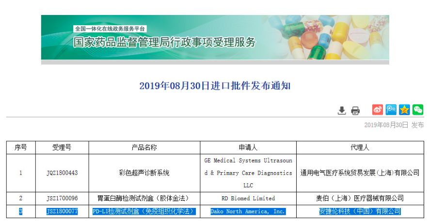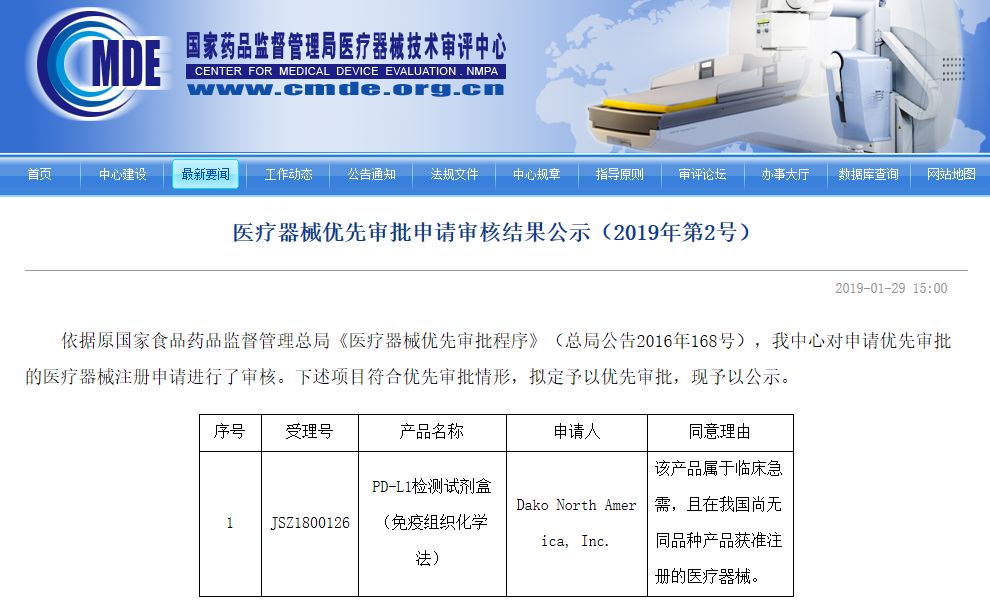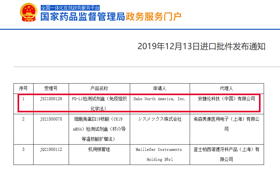 2019年8月30日,NMPA批准DAKO公司生产的PD-L1检测试剂盒(免疫组织化学法)PD-L1 IHC 22C3 pharmDx上市,该产品为在中国批准上市的首个PD-L1检测试剂盒。 图:NMPA正式批准丹麦DAKO公司生产的PD-L1检测试剂盒(免疫组织化学法)PD-L1 IHC 22C3 pharmDx上市 该试剂盒的预期用途为“用于定性检测中性福尔马林固定石蜡包埋(FFPE)的非小细胞肺癌(NSCLC)组织中的PD-L1蛋白,辅助鉴别可使用 KEYTRUDA®(帕博利珠单抗)治疗的NSCLC患者。” 该试剂盒的获批在国内创造了两个记录:第一,DAKO 22C3是国内首个正式获批应用于临床诊疗的PD-L1检测试剂盒;其二,DAKO 22C3是国内首次批准PD-1免疫检查点抑制剂类药物伴随诊断的检测试剂盒。 |