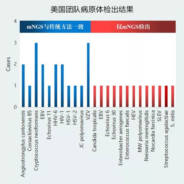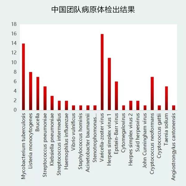 美国团队通过mNGS共检测出23种不同的病原体,包含14种病毒(20例)、6种细菌(6例)、2种真菌(4例)和1种寄生虫(2例)。中国检出22种病原体,包含11种细菌(45例)、7种病毒(39例)、2种真菌(8例)和2种寄生虫(6例),其中细菌中结核分枝杆菌(14例)、单核细胞增多性李斯特氏菌(8例),病毒中水痘带状疱疹病毒(16例)、单纯疱疹病毒1型(11例),真菌中新生隐球菌(7例),寄生虫中猪肉绦虫(5例)占主要比例。