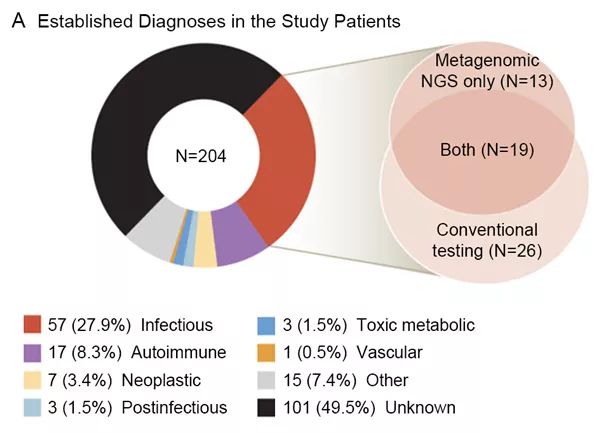 美国团队:本研究为期一年,纳入美国8家医院共204例原发性脑炎、脑膜炎、脊髓炎患者,综合评价脑脊液mNGS在诊断中枢神经系统(CNS)感染方面的表现,并与传统检测方法如培养、PCR和血清学检测等进行比较。