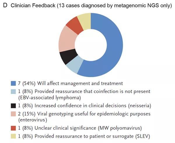 美国团队:共57例患者(27.9%)的58例样本确定为感染,其中mNGS诊断出32例感染,传统检测方法诊断出27例感染。58例感染样本中:19例(32.8%)mNGS检测结果与传统检测一致;13例(22.4%)仅通过mNGS鉴定出致病原,后续被正交实验验证;26例(44.8%)仅通过传统检测鉴定出致病原,其中11例仅通过血清学方法诊断(其他传统检测方法(如培养、PCR、抗原检测)均为阴性),7例使用脑组织进行检测(非脑脊液样本,未进行脑脊液mNGS检测),8例mNGS检出序列数低而未达到汇报标准。在仅提高mNGS诊断出致病原的13例患者中,临床医生表示mNGS的结果对8例(62%)患者的临床治疗有积极的影响。