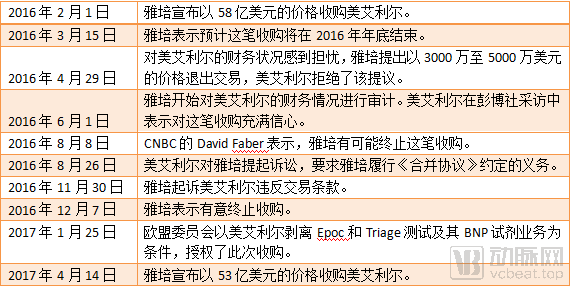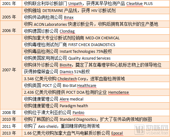 经历了多场风波之后,2017年4月,雅培最终宣布以每股51美元,总价53亿美元的价格收购美艾利尔(Alere)。 美艾利尔成立于1991年,总部位于美国马萨诸塞州沃尔瑟姆,是一家专注于研发、生产和销售POCT试剂和医疗器械的体外诊断企业。 美艾利尔拥有超过100个疾病分类的专业产品和知识,为北美、欧洲、澳大利亚、日本、以色列等100多个国家提供高端的诊断测试产品。资料显示,2016年,美艾利尔的营业收入为23.76亿美元,占领了全球POCT领域(血糖除外)20%的市场份额。 美艾利尔从在美国成立,到成为POCT领域的领导者,再到被雅培收购,只有短短15年的时间。 强力并购,在POCT领域形成超大体量 1991年,犹太商人Ron Zwznziger凭几千美元起家,创立了美艾利尔的前身SelfCare,并研发出了全球第一代血糖仪Medisense。 1996年,SelfCare将Medisense以8.8亿美元的价格出售给了雅培,使雅培成功进入了血糖监测领域。2001年,公司将第二代血糖仪LifeScan以13亿美元的价格出售给了强生。这两笔交易,为公司快速积累了大量资金。 出售血糖业务之后,SelfCare将业务集中在了毒理学检测、心肌标志物和传染病检测领域。2000年,SelfCare改名为Inverness,并在美国证券交易所(ASE)挂牌上市。 2001年至2005年期间,Inverness在体外诊断领域的发展并不突出,营业收入在3至5亿美金左右。 2006年,Inverness宣布全资全额收购圣地亚哥的临床诊断试剂公司ACON Laboratories(艾康),包括其位于杭州的一家诊断试剂产品制造厂。这笔收购使得艾康位于杭州的工厂成为了Inverness转移发达国家生产的基地。 转折发生在2007年。 2007年,Inverness以18亿美元的价格从贝克曼手中抢夺了Biosite。这笔收购使Inverness一战成名。 Biosite专注于POCT和蛋白质抗体免疫技术,先后推出了药物滥用检测、心脏生化标志物检测等数十个系列的产品。收购Biosite后,Inverness的年营收突破了10亿美元,奠定了在POCT领域,尤其是毒理学和心脏标志物领域的领导地位。 此后,Inverness开始频频出现在资本并购市场。光是2007年,Inverness就收购了21家公司。 美艾利尔部分收购事件整理,资料来源网络 2007年,收购Biosite、Choletech、Cholestech Corp后,美艾利尔营收增长98.93%。值得注意的是,收购Biosite后,公司营业利润增长6703.1%。 2010年,在成立10周年之际,Inverness将qixia60多个子公司的品牌进行了整合,统一更名为美艾利尔,向“连接病人的健康管理”理念发展,旨在打造成为更加知名的POCT品牌。 2013年,美艾利尔收购了血气与电解质诊断公司Epocal。引入Epocal血气分析系统之后,美艾利尔的营业收入达到了30亿美元。 在美艾利尔十多年的发展历史中,并购一直是其发展的主旋律。通过强力并购,美艾利尔成为了POCT领域的领导者之一。截止2017年1月,美艾利尔的市值为34.7亿美元,企业价值为59亿美元。 拥有丰富产品线,三大核心业务线占比达到93% 美艾利尔的产品线包括13条自主研发产品线,以及11条并购产品线,产品覆盖心血管疾病诊断、毒理学检测、传染性疾病诊断、女性健康检测和肿瘤检测。其中,心血管疾病检测、毒理学检测、传染性疾病检测三大产品线占比达到93%。 心肌标志物 美艾利尔是全球范围内心肌标志物POCT诊断的龙头企业,拥有最为丰富的产品线,包括 心衰项目(BNP,单项);心梗项目(Myo,CK-MB,cTnI,三项联合);栓塞项目(D-Dimer,单项);胸痛(Myo,CK-MB,cTnI,BNP 四项联合);呼吸困难 (Myo,CK-MB,cTnI,BNP,D-Dimer 五项联合)。 Triage是一种领先的新型快速诊断检测系统,由一个测量仪和各种检测设备组成,可提高医生诊断危重疾病和症状的能力,包括心脏衰竭和心肌梗死等,还可辅助评估肺栓塞患者的病情。 2016年,Triage在全球装机量达16000台,销售额为 1.97亿美元,51%的收入来自美国以外的区域。2017年,Triage以4亿美元的价格出售给了Quidel。 另外,CHOLESTECH LDX分析仪也是美艾利尔的一大拳头产品。该产品可在5分钟内准确完整地检测血脂、胆固醇和血糖。 传染病检测 在重大传染病检测领域,美艾利尔全球领先,拥有全面的解决方案,产品包括位居世界前列的HIV、流感、疟疾、链状病毒、军团菌属、链锁状球菌A、登革热、呼吸道合胞病毒等病毒的检测仪器。 2016年,美艾利尔传染病检测系列产品的销售额为7.7亿美金,2015年为7.1亿美金,在该细分领域的市场占有率全球第一。 Alere CD4是全球首个便携式CD4即时检测系统,可帮助HIV患者便捷进行抗逆转录病毒治疗。Alere CD4由Alere T淋巴细胞计数仪和Alere CD4淋巴细胞检测试剂盒组成,用于计数毛细血管全血或静脉全血中的CD3+/CD4+ T细胞的绝对值,只需插入试剂板即可进行自动检测,20分钟即可获得结果。并且,该系统没有需要维护保养的部件,既可在实验室环境操作,也可在非实验室环境操作。 艰难梭菌是造成医院感染和住院病患腹泻的常见细菌。感染该细菌通常会伴随伪膜性结肠炎的出现,一旦出现这种情况,死亡率会猛增到35%到50%。美艾利尔qixiaC. DIFF QUIK CHEK COMPLETE是目前唯一能够同时检测谷氨酸脱氢酶(GDH)抗原以及艰难梭菌毒素 A 和 B 的快速检测试剂盒,耗时不到 30分钟,只需一次就可获取完整的诊断信息。 毒理学检测 美艾利尔提供毒品和酒精检测产品,服务于医院、医生办公室、刑事司法机构、康复中心、职业健康诊所和家庭。 美艾利尔的DDS 2唾液吸毒检测系统可通过唾液针对6种常见毒品快速筛查吸毒行为,5分钟内即可得出检测结果,可以有效替代尿检。便于携带