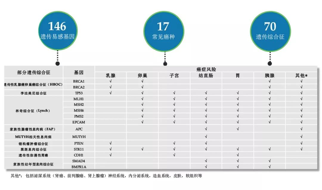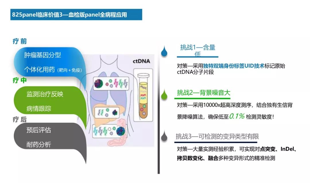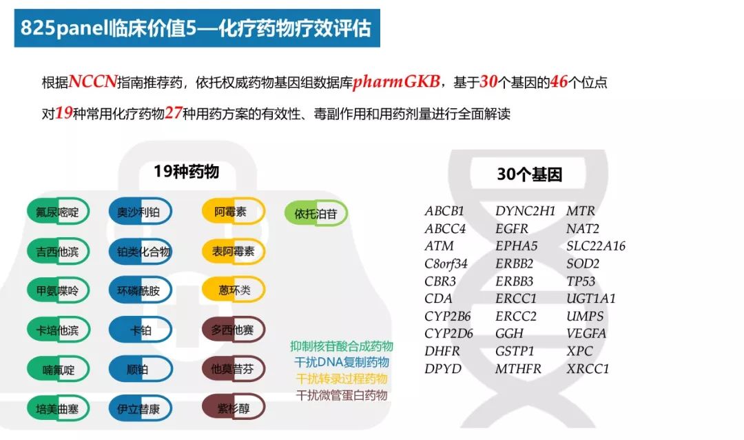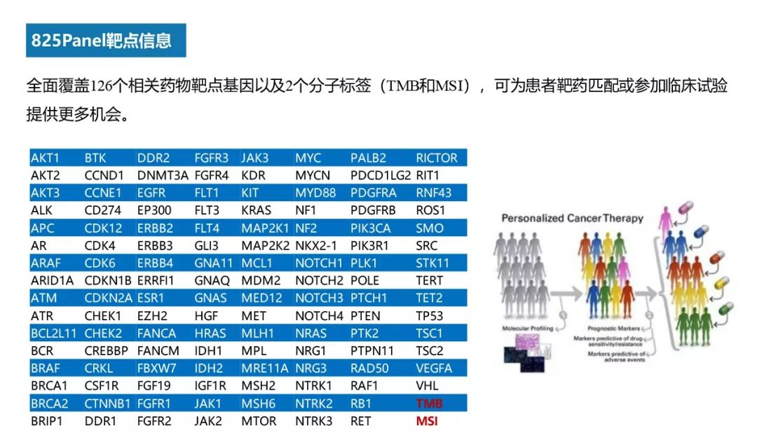 产品临床价值 1、辅助免疫治疗 在未经筛选的患者中,免疫治疗的有效率只有10%~30%。泛生子825基因检测通过科学设计捕获区域(覆盖区域>1Mb,并参考FDA获批的两个NGS大panel产品—F1CDX和MSK-IMPACT),采用国际主流算法,联合多检测平台可为临床提供TMB、PD-L1、MSI、MMR等免疫治疗相关生物标志物的检测,有效锁定免疫治疗获益人群,评估免疫治疗疗效,“引路”免疫治疗攻城拔寨。 2、靶向药物匹配 ▲825Panel临床价值(图片取自:泛生子,“*”为FDA、CFDA共同批准的靶向药物、“#”为CFDA批准的靶向药物,字体标红为免疫治疗药物) 涵盖NCCN指南推荐、FDA/CFDA批准,及部分处于临床试验阶段药物共计250多种肿瘤相关靶向药物。 3、全病程应用 血液版检测可为无法取得组织的患者无创便捷的提供更优检测方案;此外,血液版检测可实现多次取样,为患者达到疗前(肿瘤基因分型、靶向及免疫的个体化用药)、疗中(预后评估、耐药分析)、疗后(监测治疗情况、跟踪病情发展)的全病程管理应用,协助患者治疗方案的及时调整和更换。实体瘤825基因检测延续泛生子专有的无创液态活检技术(UDD-Seq)优势,采用独特双端身份标签UID技术标记原始ctDNA分子片段,结合超高深度测序和独有生信背景降噪算法,从而更好的实现对低频变异的准确检出,不遗漏对临床诊疗有价值的关键信息。 4、评估遗传风险 参考权威论文及指南,可同时检测148个遗传易感基因,涉及17个常见癌种、70种遗传综合征,致力于全面评估遗传易感风险。 5、化疗药物疗效评估 根据NCCN指南推荐药,依托权威药物基因组数据库PharmGKB,基于30个基因的46个位点,对19中常用化疗药物27中用药方案的有效性、毒副作用和用药剂量进行全面解读,使患者能更全面的了解自身基因突变情况,从而抓住更多接受创新性治疗的机会。 |