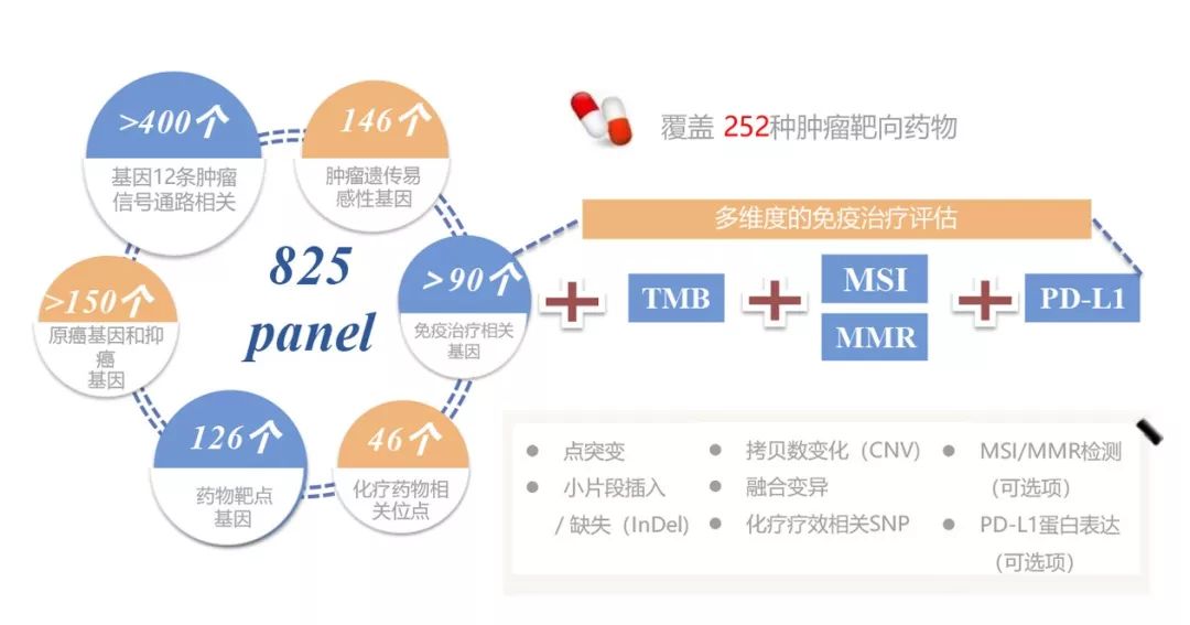 实体瘤825基因检测 实体瘤825基因检测产品基于高通量、高灵敏度的NGS平台和“杂交捕获”技术,一次性检测825个癌症相关基因,涵盖了更新版本的WHO、NCCN、ESMO等权威指南及专家共识推荐检测基因,并结合泛生子基因上万例中国肿瘤患者的基因突变区域和遗传突变位点信息开发设计,多平台的联合应用可提供多维度的免疫治疗相关生物标志物检测(TMB、MSI、PDL-1、免疫疗效相关基因变异),从而更精准的指导肿瘤患者的个体化诊疗,亦为科研人员提供更加全面的参考信息。