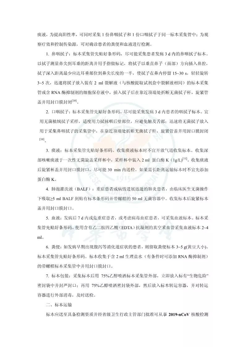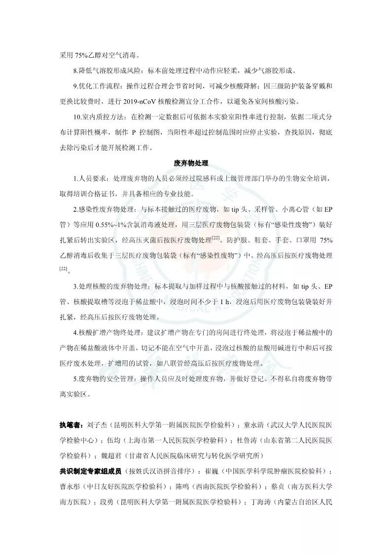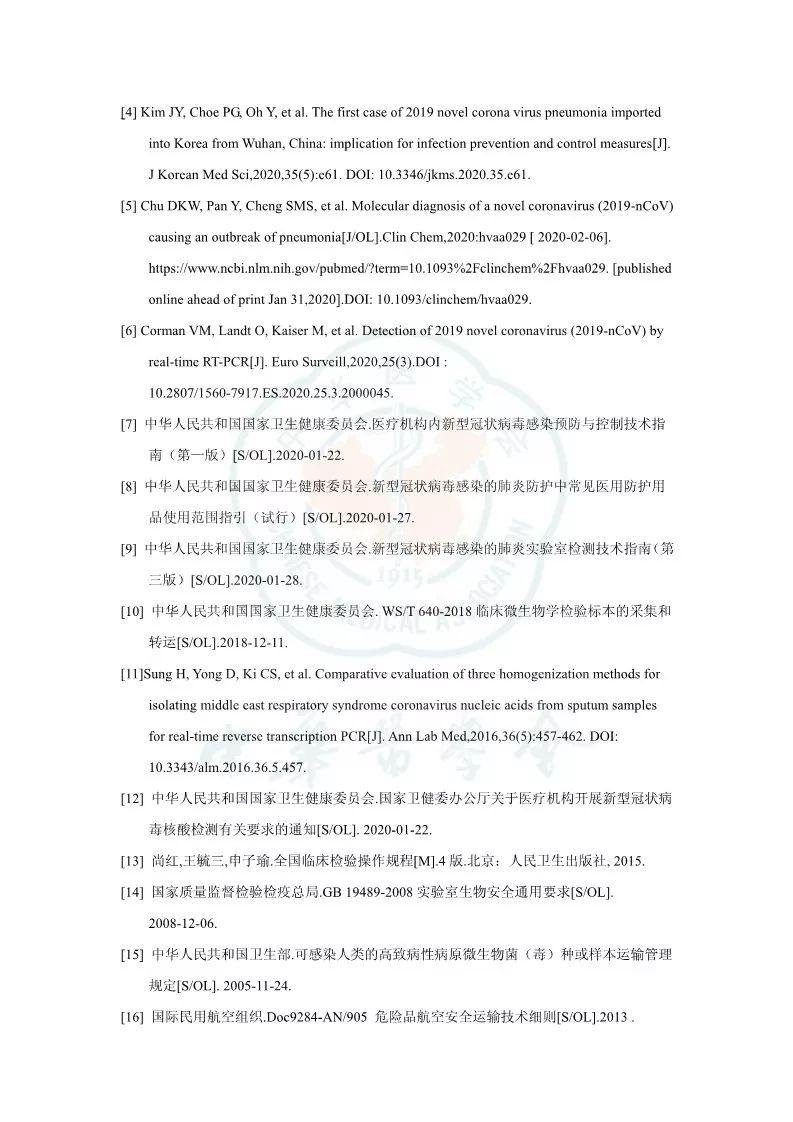 突发新型冠状病毒(2019 novel coronavirus,2019-nCoV)肺炎疫情以来,感染病例快速上升。随着疫情的发展和防控力度加大,全国各地乃至境外均有病例报道,及时对急重症及疑似患者进行诊断需要快速有效的方法,病毒核酸检测可为诊断提供直接证据。核酸检测过程中因对病原体的传染途径和致病力尚未完全明确,工作人员在核酸检测过程中存在较大的感染风险。此外,因为 2019-nCoV 基因结构与一般 RNA 差别较大,因此检验流程、检验质量和生物安全均需要有一定的指导。本共识在参阅国家卫生健康委员会相关文件、查阅文献、咨询重疫区相关专家的基础上进行编写,以对实验室检测工作提出有指导性的建议,本共识适用于从事 2019-nCoV 核酸检测(如RT-PCR方法)的所有实验室。 参考资料: |
