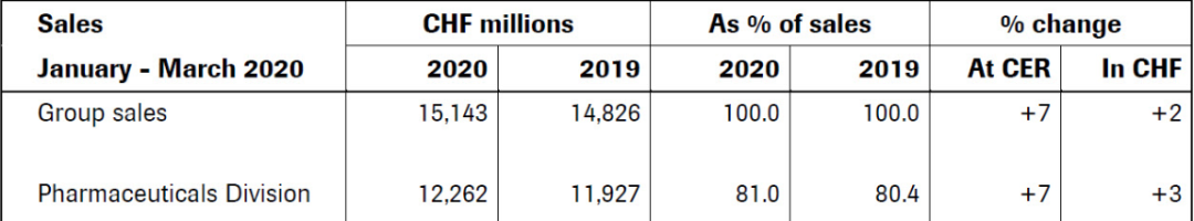 2020年是全球医疗行业的分水岭,潜藏在新冠疫情的背后,是更大的经济、商业危机。丘吉尔有句话:“千万不要放过一次危机! 逆境之中,罗氏用行动告诉我们:萧条下的局部繁荣是真的可以持续。 ▲2020年Q1罗氏营收 4月22日,罗氏发布2020年第一季度财报,本年度迎来了开门红:集团全球营收151.43亿瑞郎(156.28亿美元),同比+2%。其中