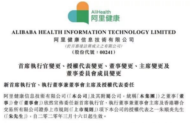 3月15日,阿里健康宣布最新一轮组织升级,公司董事会委任朱顺炎担任首席执行官(CEO)、执行董事兼董事会主席;阿里健康现任董事会主席吴泳铭将以非执行董事身份继续在董事会任职;而阿里健康现任首席执行官(CEO)沈涤凡则将重新加入阿里巴巴集团。