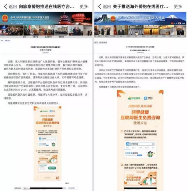 3月8日,阿里健康宣布,开通海外侨胞在线医疗咨询专区,意大利和日本率先使用。8日下午,中国驻意大利大使馆、中国驻日本大使馆等分别通过其官方渠道为该国侨胞提供咨询指南,建议在线上咨询医生。