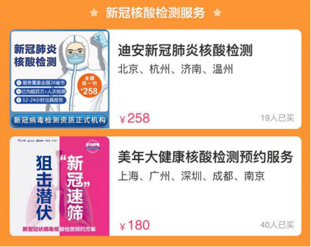 目前,北京、杭州、上海、广州、成都、南京、深圳、西安、温州、济南10大城市的居民,自昨日(4月21日)起,就可以在淘宝或天猫搜索“新冠核酸检测”,进行在线预约了。