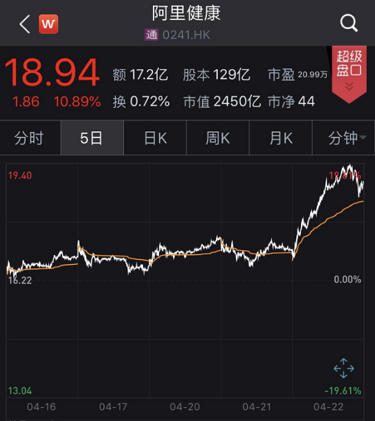 截止收盘,阿里健康报18.94元/股,当日成交额为9351万,最新总市值达2450港元。已超过小米集团(1810.HK)最新2434亿港元的市值。