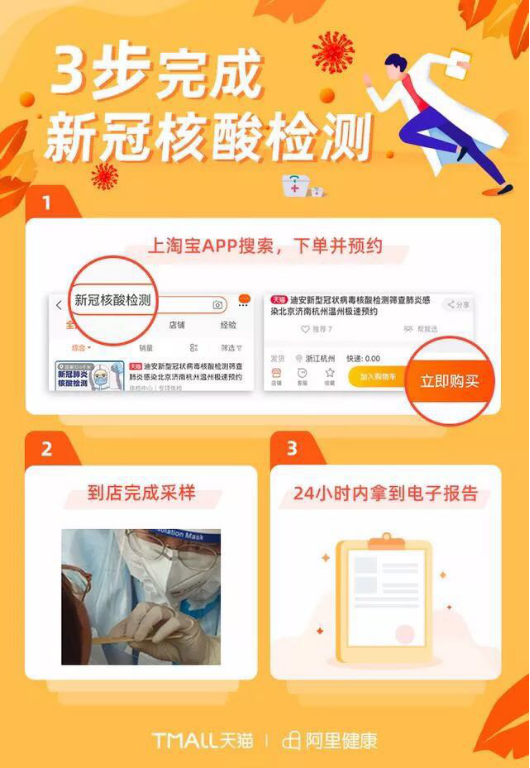 阿里健康再放战“疫”大招,联手美年健康、迪安检测开设全网新冠核酸检测平台。用户只要在淘宝或天猫平台上下单便可预约检测地点与时间,检测后最快24小时内就能拿到电子报告。这也是阿里日前启动的“春雷计划”中,助力全社会打赢抗击疫情“下半场”的重要创新举措之一。