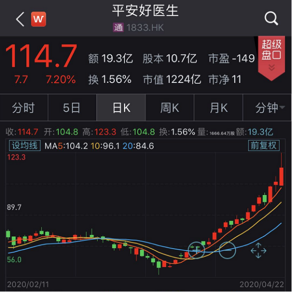 截止收盘,平安好医生今日上涨7.20%,报收114.7港元/股,最新总市值为1224亿港元。