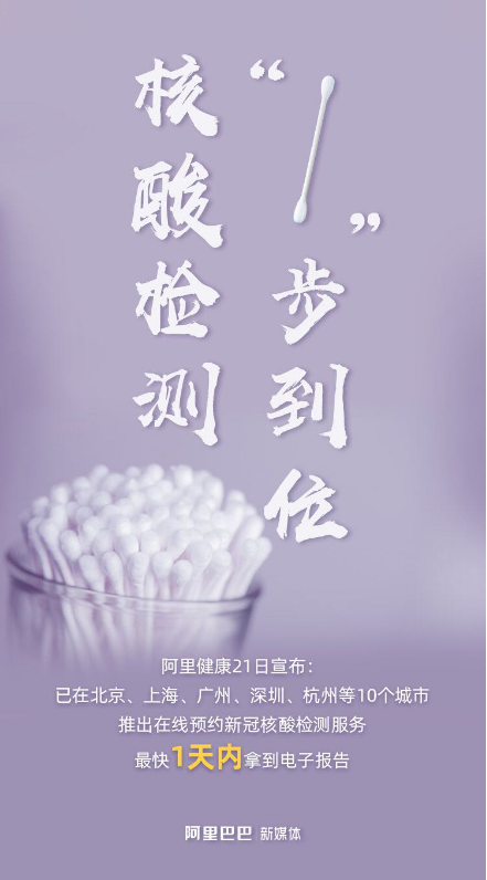 摘要: 好消息,新冠核酸检测可以线上预约了。阿里健康再放战“疫”大招,联手美年健康、迪安检测开设全网新冠核酸检测平台。用户只要在淘宝或天猫平台上下单便可预约检测地点与时间,检测后最快24小时内就能拿到电子报告。 ...