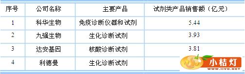 注:资料来源:Kalorama Information。 国内诊断试剂行业起步比较晚,相比国外领先企业来说,国内体外诊断试剂行业集中度低,企业规模都比较小,竞争力较弱。目前我国体外诊断试剂生产企业有300-400家,规模较大的公司有科华生物、达安基因、九强生物、利德曼、深圳迈瑞、四川迈克、中生北控、复星长征等,其中已上市公司有科华生物、达安基因、利德曼、中生北控等。