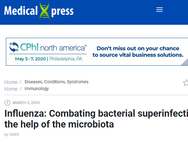 导读:流行性感冒(简称流感)是流感病毒引起的急性呼吸道感染,也是一种传染性强、传播速度快的疾病。而流感病毒是世界范围内导至人类高发病率和高死亡率感染疾病的重要原因之一。严重流感病毒感染引起的高死亡率常与流感病毒流行期间继发细菌感染有关。如此以来,抵抗细菌感染至关重要,目前的研究是否有相关突破呢? 昨日,法国国家科学研究中心(CNRS)在medicalxpress上发表了一篇有关流感的文章,研究了微生物群和细菌感染之间的联系,发现微生物群的扰动有助于细菌重叠感染。