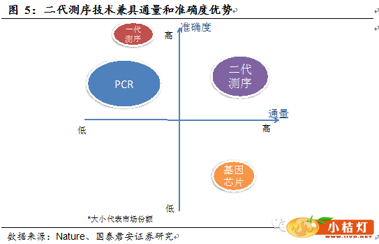 目前使用比较广泛的基因表达检测手段依然是PCR和基因芯片技术。PCR一次只能检测单个或少量基因,而基因芯片虽然可以检测大量基因,但假阳性率高,准确性不足。新一代测序具有高通量、准度高的优点,既可以一次性检测大量基因,准确率又高于基因芯片。长期来看,如果测序的成本可以下降到有足够竞争力,基因芯片的市场将不可避免的被侵占。