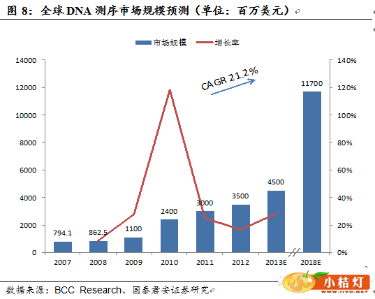 基因测序(DNA测序)产业近些年得到迅猛发展。尤其是新一代测序技术诞生以来,全球基因测序市场总量从2007年的794.1万美元增长至2013年的45亿美元,预计未来几年全球市场仍将继续保持快速增长,2018年达到117亿美元,CAGR21.2%(数据来自BBC research)。