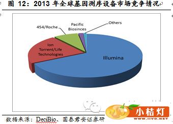 目前市场上主流新一代测序平台主要由美国Illumina、Ion Torrent/Life Technologies (2014年被Thermo Fisher收购)、454 Life Sciences/Roche、 PacificBiosciences这四大生产商制造。 Illumina是一家致力于开发、生产和销售大规模基因组学分析集成系统的公司,它已经成长为基因测序行业的巨头,占据了全球设备市场三分之二的市场份额,其生产的下一代高通量测序仪HiSeq系列一直是市场上最为畅销的产品。另一方面,Life Technoloiges凭借小巧轻便的台式测序仪Ion PGM和Ion Proton也分割了20%以上的市场份额。而Roche曾收购454 成为第一个进入高通量测序市场的公司,近几年却因新产品匮乏导致市场份额不断收缩。