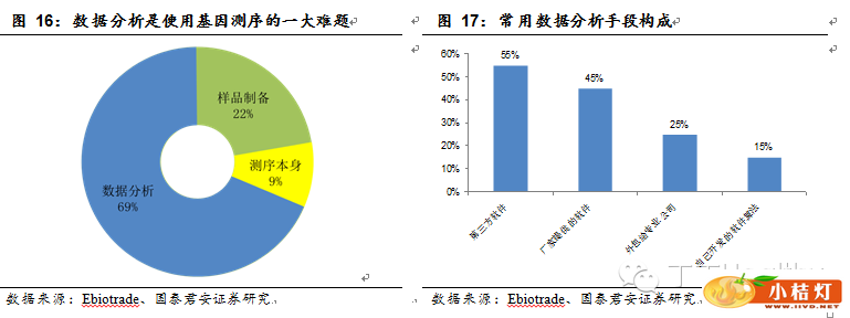 Ebiotrade调查结果显示,普遍认为数据分析是使用基因测序的一大难题。目前仅有25%的受访者选择外包给专业的生物信息公司,大部分使用者选择用现有软件自行分析。但随着未来数据量越来越庞大,外包给专业化的生物信息公司将成为一种趋势。提供相关产品和服务的主要公司主要有 CLC bio (丹麦), Biomatters (新西兰), Partek (美国), Genomatix (德国), Knome (美国), DNASTAR (美国),诺和致源(中国)。目前这一市场份额基数较小,蕴含着巨大的市场潜力。