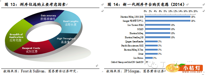 国产测序仪的前景如何目前还很难断言。Frost & Sullivan的调查结果显示,测序成本、数据质量、读取长度、通量大小、适用范围是选购新测序仪时最主要的考虑因素。尽管这两年新款的测序平台层出不穷,但在JPMorgan的受访实验室中,Illumina HiSeq2500/2000仍是优先考虑的产品,同时一代Sanger测序仪也有一定的市场。