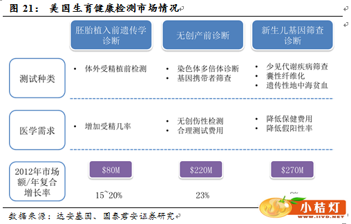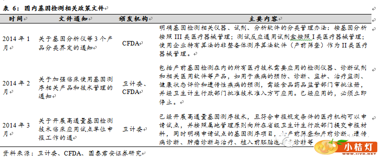 同时,Illumina的的测序仪MiSeqDx已获得FDA认证,这有助于加快其他仪器甚至是Life Tech仪器在FDA的认证过程。目前国家开放基因检测试点申请效仿的即是美国CLIA制度,因此基因检测试点的选拔标准对决定企业能否取得合法身份尤为重要。国内企业开展基因检测业务现有两种途径,一方面按照国家规定积极申请试点实验室资格,另一方面对进口仪器进行国产贴牌,向CFDA申请注册新型基因检测设备。目前已经向CFDA申请批文的产品分别是华大基因的BGISEQ1000(基于CG的测序平台)和BGISEQ100 (基于LifeTechnologies公司的IonProton测序平台)、贝瑞和康和Illumina联合开发的新型测序仪、达安基因的DA8600(同样基于LifeTechnologies公司的IonProton测序平台)。尽管批复进展暂未可知,但可以预测随着基因测序试点的开放,生育健康领域的相关业务将陆续恢复。