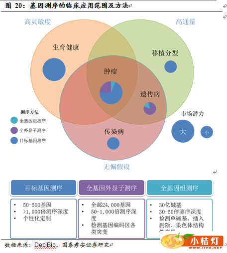 以新一代测序技术为代表的基因检测具有高通量、高灵敏度、不需要了解遗传背景(无偏假设)的优点,主要在临床上应用于五个领域:生育健康、肿瘤个体化诊断和治疗、遗传病、传染病、移植分型(HLA)。