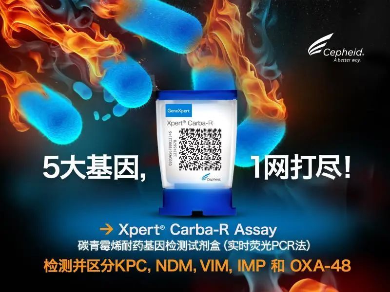 2020年4月24日,赛沛 Xpert® Carba-R Assay碳青霉烯耐药基因检测试剂盒(实时荧光PCR法),国械注进20203400221,喜获国家药品监督管理局(NMPA)认证。该检测基于自动化实时聚合酶链反应(PCR),用于体外定性检测直肠拭子样本和纯菌落中的碳青霉烯耐药基因ᵇˡᵃKPC、ᵇˡᵃNDM、ᵇˡᵃVIM、ᵇˡᵃOXA-48和ᵇˡᵃIMP,检测医疗环境下定植于患者体内的碳青霉烯类不敏感菌,以辅助进行感染控制。 碳青霉烯耐药肠杆菌(CRE)近年来形势严峻,因其高传播性,有限的治疗手段,以及高致死率,已成为全球公共卫生的重大问题1'2'3。因此,及时发现和控制以及针对CRE的精准用药至关重要,而精准的防控和治疗均依靠及时准确的诊断。Xpert Carba-R Assay可在48分钟检出碳青霉烯类抗生素的5种耐药基因,临床医生和感控专家可以使用Xpert Carba-R Assay检测和鉴别高危患者,及时发现革兰氏阴性菌(肠杆菌、铜绿假单胞菌和鲍曼不动杆菌)中是否存在导至碳青霉烯不敏感的相关基因序列,从而为碳青霉烯耐药菌感染的即时诊断、治疗和感染控制提供及时的决策依据。 1. 胡付品,医疗机构碳青霉烯类耐药肠杆菌科细菌感染防控指南简介,中国感染与化疗杂志2018 年5 月20 日第18 卷第3 期 2. Kallen AJ, et al. 2010. Current epidemiology of multidrug-resistant gram-negative bacilli in the United States. Infect Control Hosp Epidemiol. 31 Suppl 1: S51plmi 3. Nordmann P, et al. 2012. Carbapenemase-producing Enterobacteriaceae: a call for action! Clin Microbiol Infect. 18:4114ect. |
