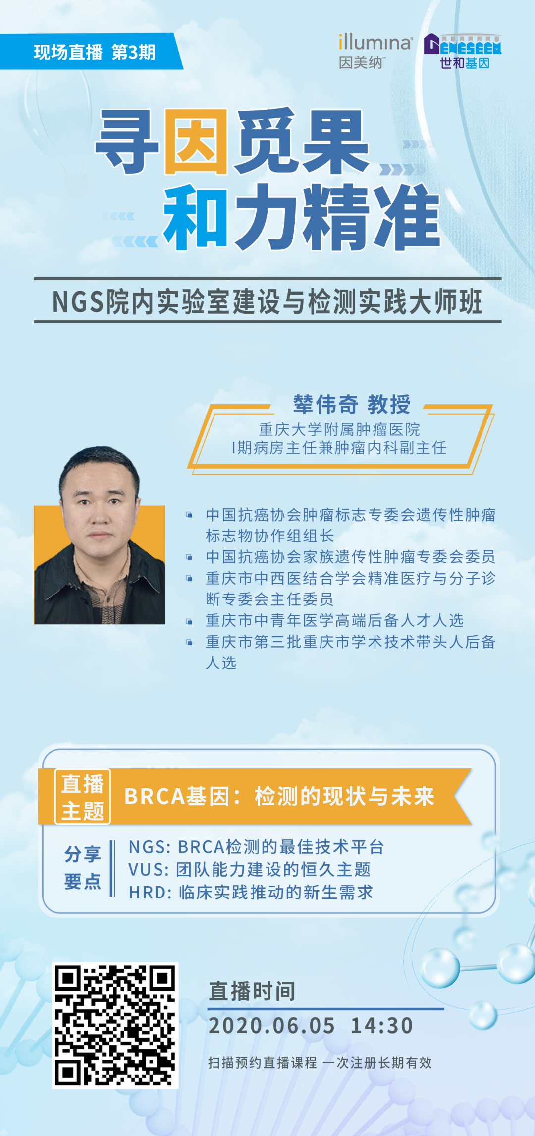 近年来,随着精准医学的快速发展,NGS技术在临床肿瘤检测领域大放异彩。2013年,MiSeq™Dx美国FDA获得认证,标志着NGS技术正式走向医院临床实验室。2018年8月,MiSeq™Dx 获得中国国家药品监督管理局监管许可。同年,世和基因试剂盒-益胜康获NMPA批准上市。这些里程碑事件都推动了NGS技术更好的服务肿瘤患者。 BRCA基因检测走在院内NGS检测的最前端。但基于NGS技术的复杂性、BRCA基因结构的特殊性等原因,在平台搭建、技术流程构建、临床决策应用等领域尚面临着诸多困惑与挑战。目前国内BRCA基因检测已取得哪些重要进展与共识?未来还存在哪些优化空间? 此次网络课程,特邀重庆肿瘤医院辇伟奇教授带来“BRCA基因:检测的现状和未来”,和大家共同探讨BRCA检测需求、面临的挑战及未来的建设方向。 第三期 | 6月5日 14:30 |